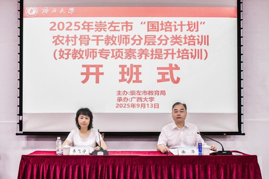 为深入贯彻落实国家关于新时代教师队伍建设改革的决策部署,提升崇左市教育系统教师的专业能力与综合素养,9月13日,由崇左市教育局统筹、广西大学承办的2025年崇左市“国培计划”农村骨干教师分层分类培训班(好教师专项素养提升培训班)在我校开班。爱体育官方网站副院长徐华出席开班式并讲话,爱体育官方网站副教授范小俊主持开班式。