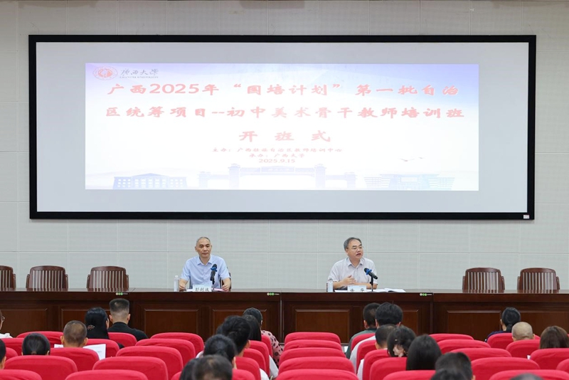 “国培计划”是落实《教育强国建设规划纲要(2024—2035年)》的重大实践。由广西壮族自治区教师培训中心主办,广西大学承办的广西2025年“国培计划”第一批自治区统筹项目--初中美术骨干教师培训班于9月15日在广西大学开班,爱体育官方网站副院长徐华出席开班式并讲话,爱体育官方网站副教授彭剑波主持开班式。